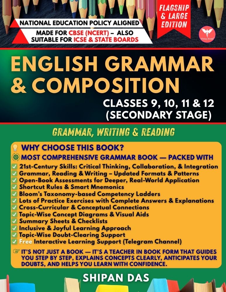 Aligned with the National Education Policy (NEP), this comprehensive book is specially designed for CBSE (NCERT) curriculum and is also suitable for ICSE and State Boards. It is an all-in-one resource to build strong grammar, writing, and reading skills for middle-school learners. Authored with a learner-centric approach, the book acts like a teacher in book form, guiding students step by step, simplifying complex concepts, and helping them learn with confidence. WHY CHOOSE THIS BOOK? i. One of the most comprehensive grammar & composition books for middle stage ii. Covers Grammar, Writing, and Reading in an integrated manner iii. Designed to develop 21st-century skills such as critical thinking, collaboration, and application iv. Uses updated formats and patterns as per current assessment trends v. Includes open-book and real-world application-based assessments vi. Features shortcut rules and smart mnemonics for easy recall vii. Structured using Bloom’s Taxonomy-based competency ladders viii. Extensive practice exercises with complete answers and explanations ix. Topic-wise concept diagrams, visual aids, and summary sheets x. Encourages an inclusive, joyful, and student-friendly learning approach xi. Provides topic-wise doubt-clearing support xii. Comes with free interactive learning support via Telegram IDEAL FOR i. Students of Classes 9, 10, 11 and 12 ii. CBSE (NCERT), ICSE, and State Board learners iii. Classroom learning, self-study, and exam preparation iv. Teachers and parents looking for a single, reliable grammar resource.